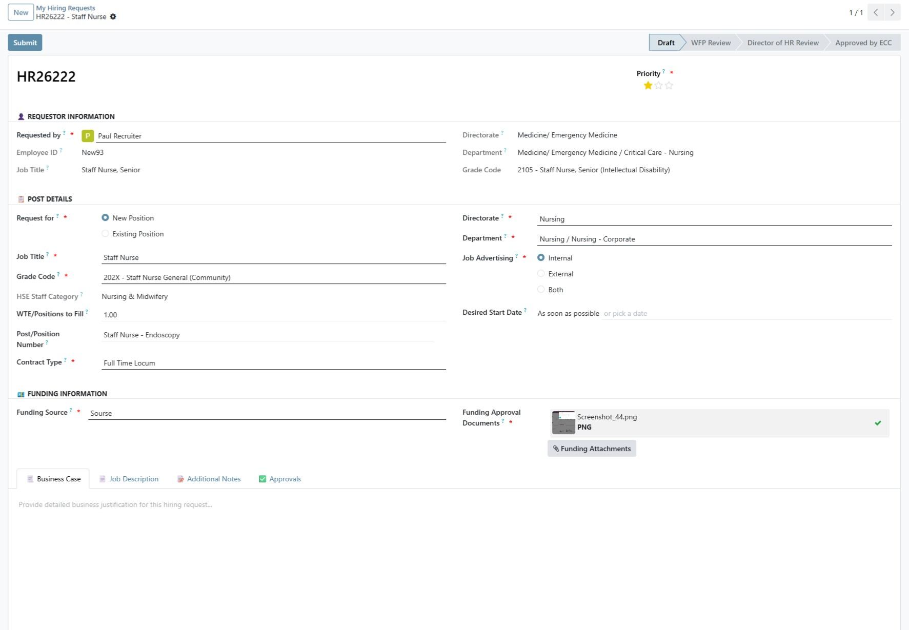 Whether it’s replacing an employee or opening a new role, every request follows a standardised structure. Managers are required to provide key details such as: